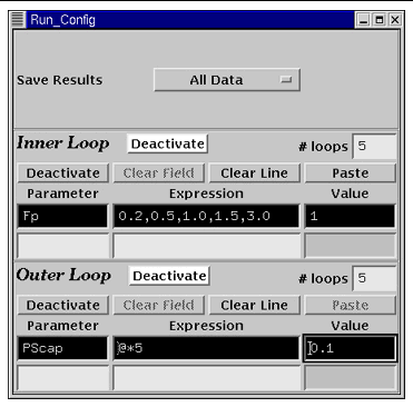 Note that you can either enter a list of parameter values for the loop (See Fp in this case) or using expression (See PScap in this case). The expression "@*5" in this case means the value of PScap increases five-fold for every simulation run.