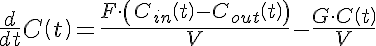 A Flow carries an inflow concentration, Cin, into a one compartment model with a given Volume. Cin is constantly and instantaneously well mixed becoming C, the concentration in the compartment. C empties out of the compartment and is designated Cout. G is a clearance rate. For a constant concentration of inflowing material the analytic solution is given.