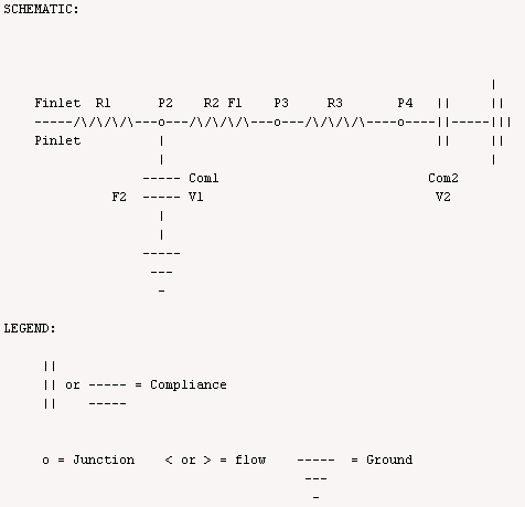 Pinlet - P2 = Finlet * R1 F1 = Finlet - F2 P2 = (V1 - V1_0)/Com1 P2 - P3 = F1 * R2 P3 - P4 = F1 * R3 P4 = (V2 - V2_0)/Com2 d(V1)/dt = F2 d(V2)/dt = F1 Where: P is pressure, F is flow, R is resistance, Com is capacitance, and V is the volume.