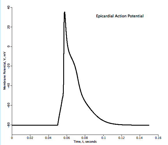 This model reproduces the action potential recorded experimentally for epicardial myocytes isolated from the adult rat left ventricle (Pandit et al. 2001).